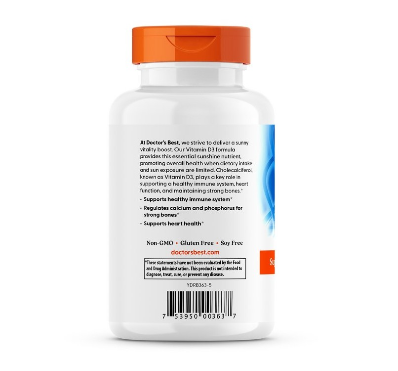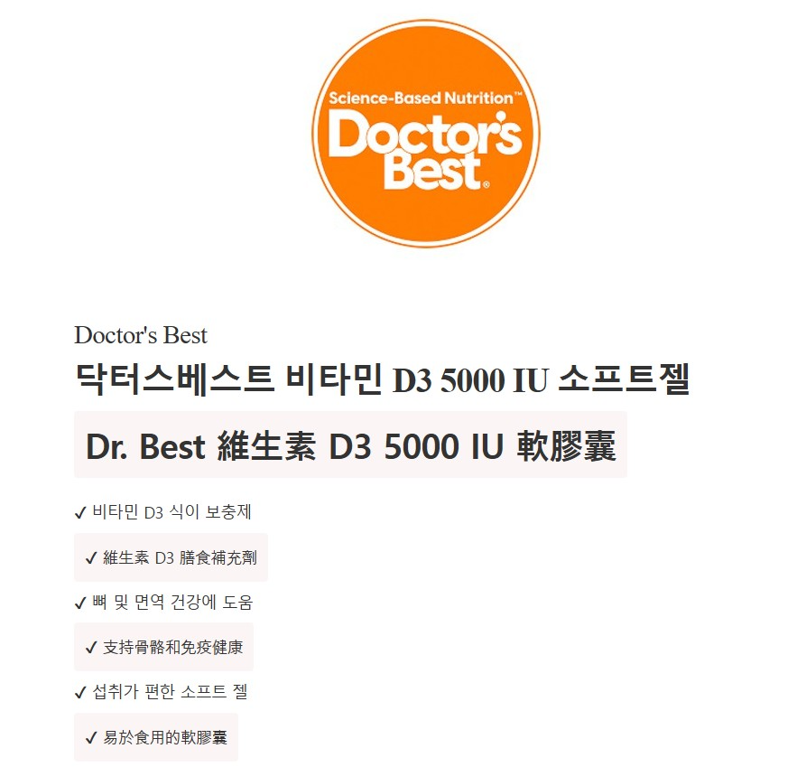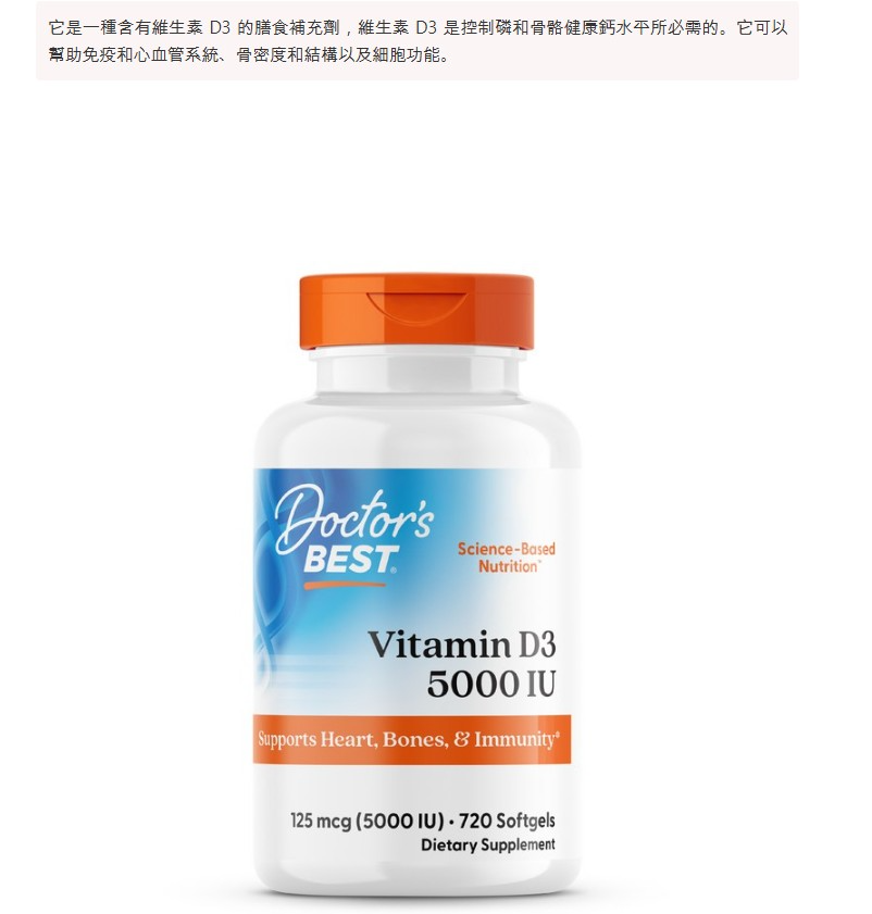 商品名稱:Doctor's BEST 維他命D3軟膠囊 5000IU 720顆 1罐