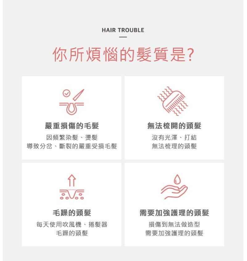 ■ 角蛋白配方能強化髮質結構,減少斷裂分岔,使秀髮更加強韌。