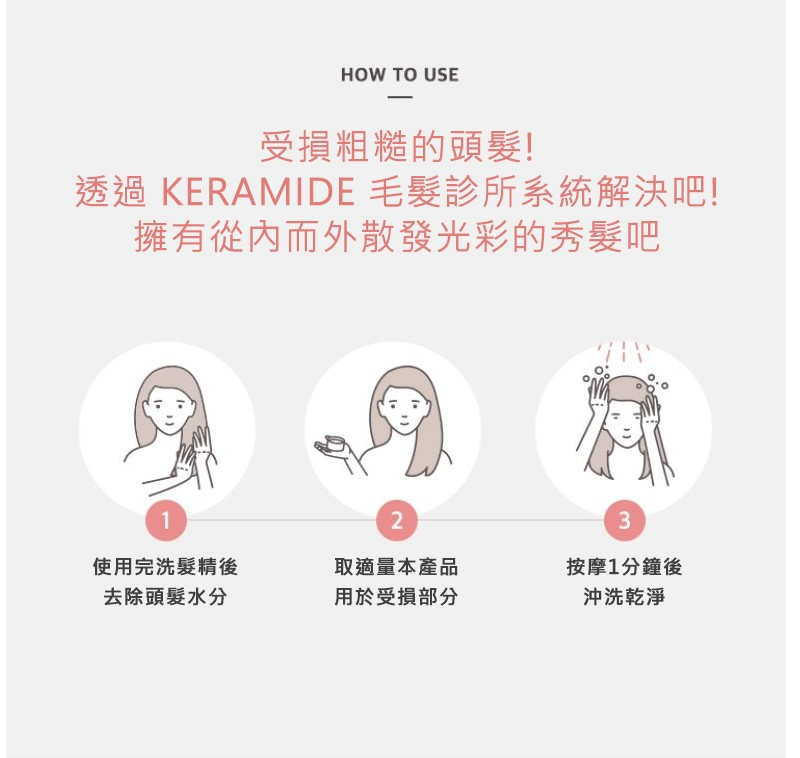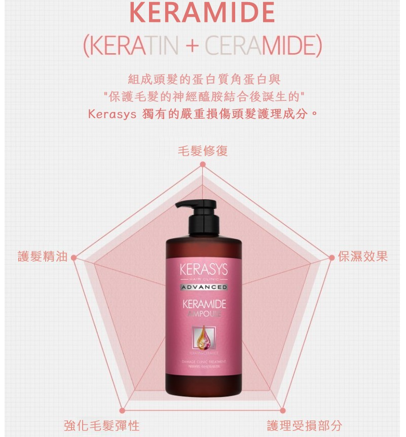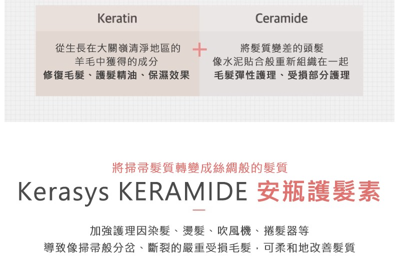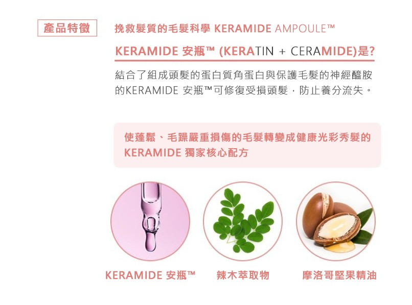 ■ 角蛋白與神經醯胺結合,深層修護染燙後受損髮質,恢復頭髮健康光澤。