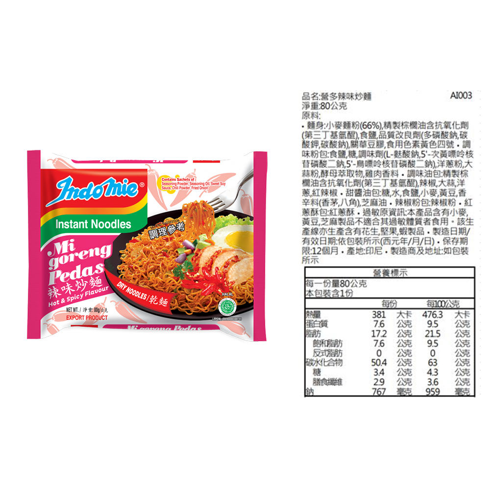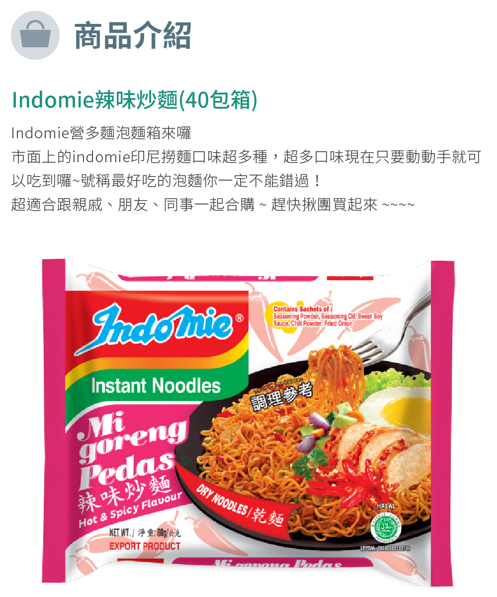 商品名稱 : 【印尼】Indomie 營多 炒麵 泡麵 X1箱(辣味炒麵)