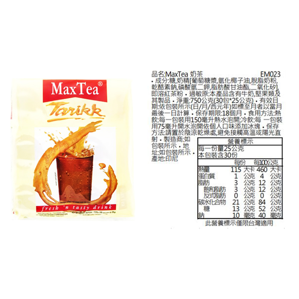 內容物說明 : 糖、奶精〔葡萄糖漿、氫化椰子油、脫脂奶粉、乾酪素鈉(牛奶蛋白)、磷酸氫二鉀、乳化劑(脂肪酸甘油酯)、矽鋁酸鈉、著色劑(β-胡蘿蔔素)〕、脫脂奶粉、即溶紅茶粉