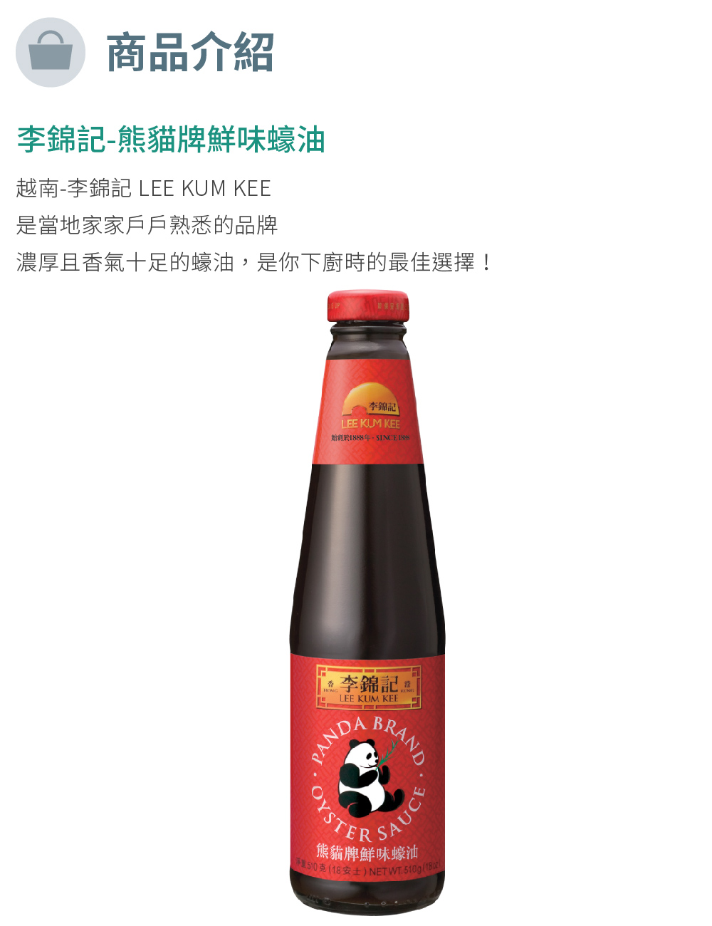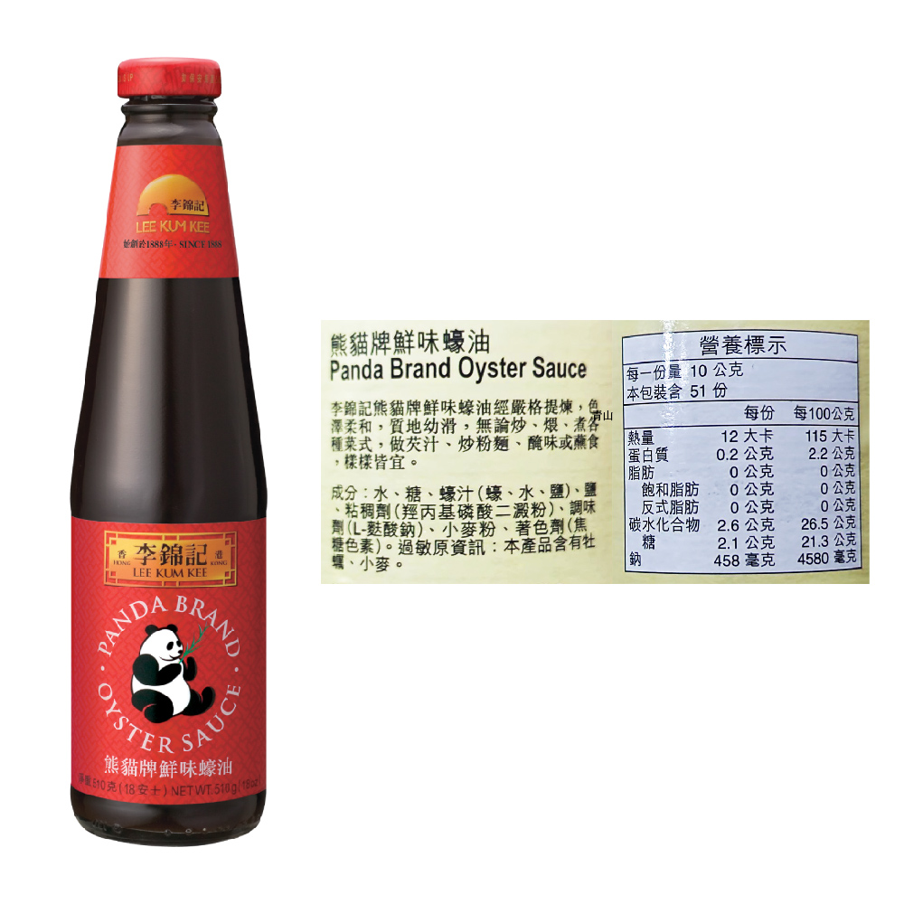 李錦記熊貓牌鮮味蠔油經嚴格提煉,色澤柔和,質地幼滑,無論炒、煨、煮各種菜式,做芡汁、炒粉麵、醜味或蘸食,樣樣皆宜。