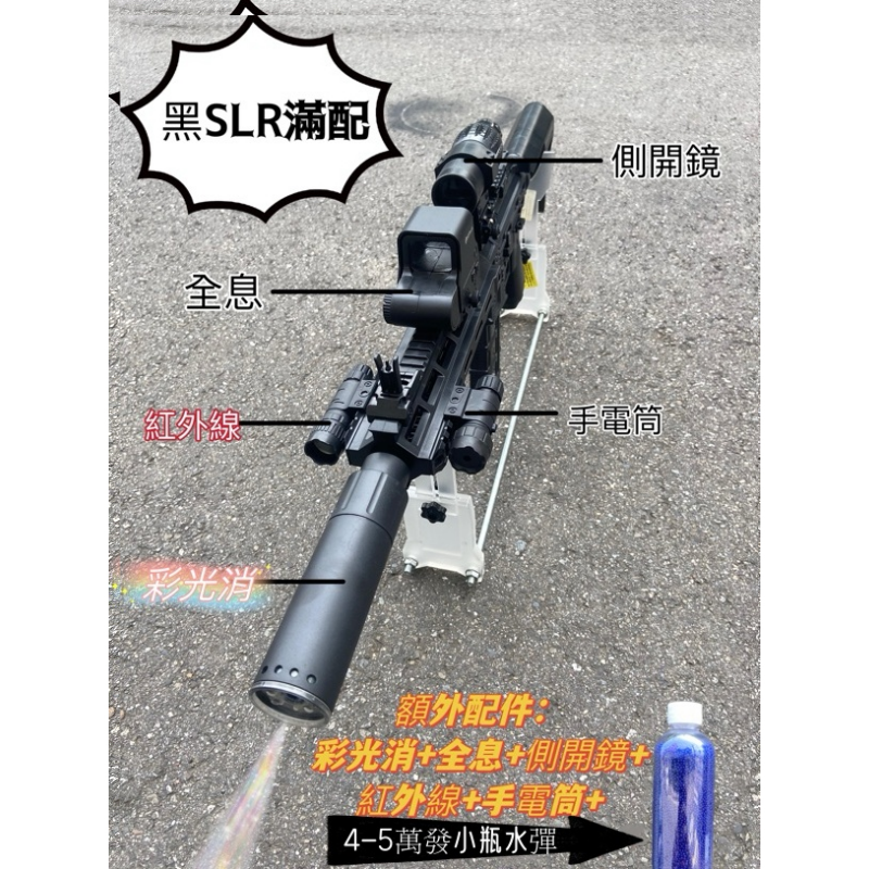 滿配額外配置:裝飾全息,裝飾側開瞄準鏡,4-5萬發小瓶乾燥水彈,閃光消,電供匣+1。