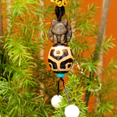 已經編好繩頂珠是琥珀,下面隔片是綠松石,最下面是三大菩薩五條路路通(1.資糧道 2.加行道 3.見道位 4.修道位 5.究竟位)。