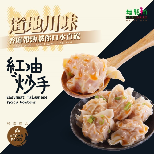 輕鬆⾁冷凍微波輕食新品紅油抄⼿,以滑溜麵⽪包進⼤⾖蛋⽩內餡,30年老道經驗師⽗掌握絕佳餡