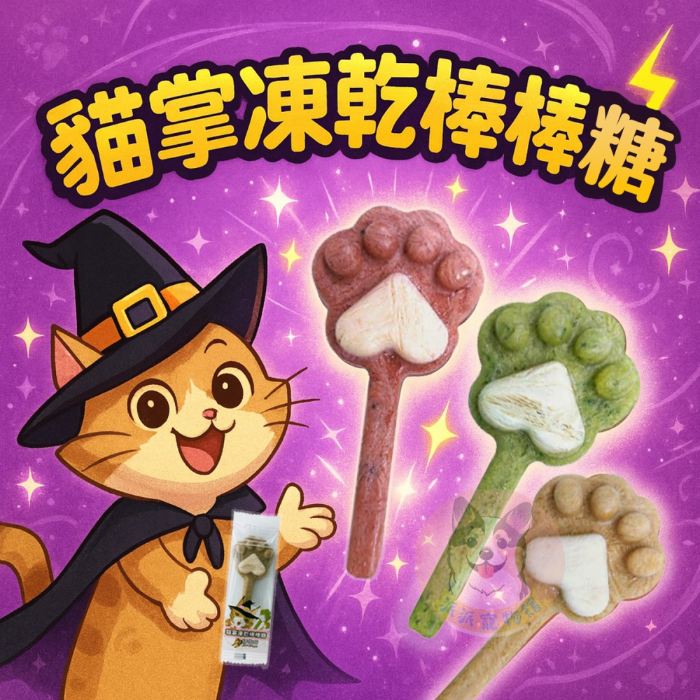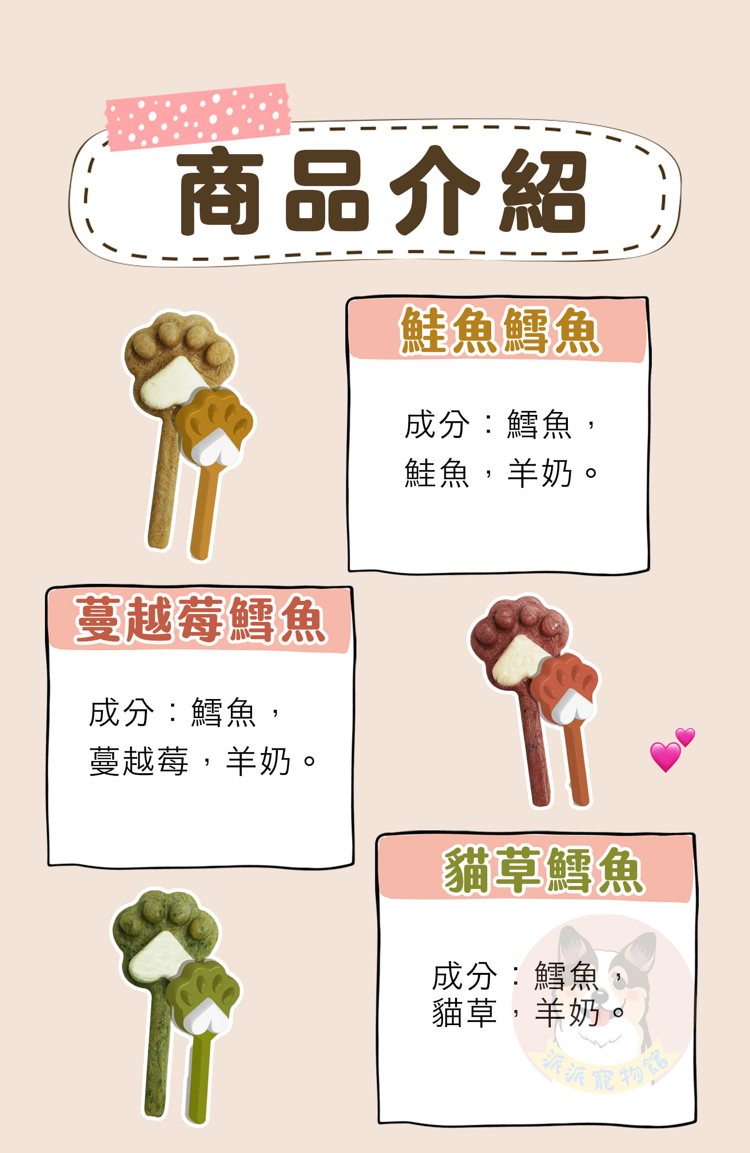 可愛貓掌棒棒糖🍭 鱈魚×羊奶為基底,三款人氣口味(鮭魚/蔓越莓/貓草)。