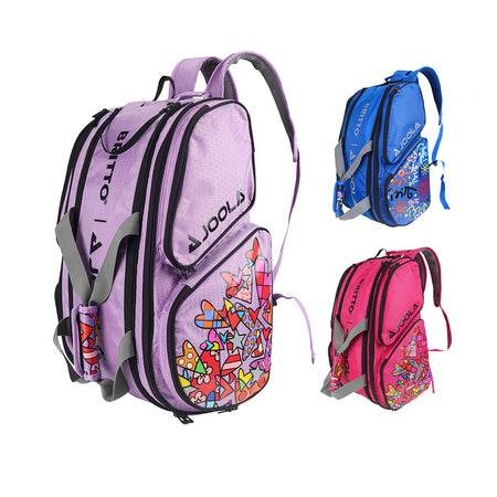 JOOLA x Britto Tour Elite Bag 專為那些永遠不會忘記為球場帶來歡樂和幸福的球員而設計。 Britto pickleball 包融入了世界知名藝術家的設計,色彩大膽,同時展現了他的獨特風格。 Britto 包的印花通常被收藏在博物館中,讓玩家可以在槳包上展示他們對藝術的熱愛,該槳包可容納多個槳並具有多個隔層。其他功能包括堅固的柵欄鉤、雙背包和行李袋帶,以及獨特的箔內襯槳存儲裝置,以防止極熱或極冷。此包包的尺寸為 38cm x 56 cm x 25.4cm