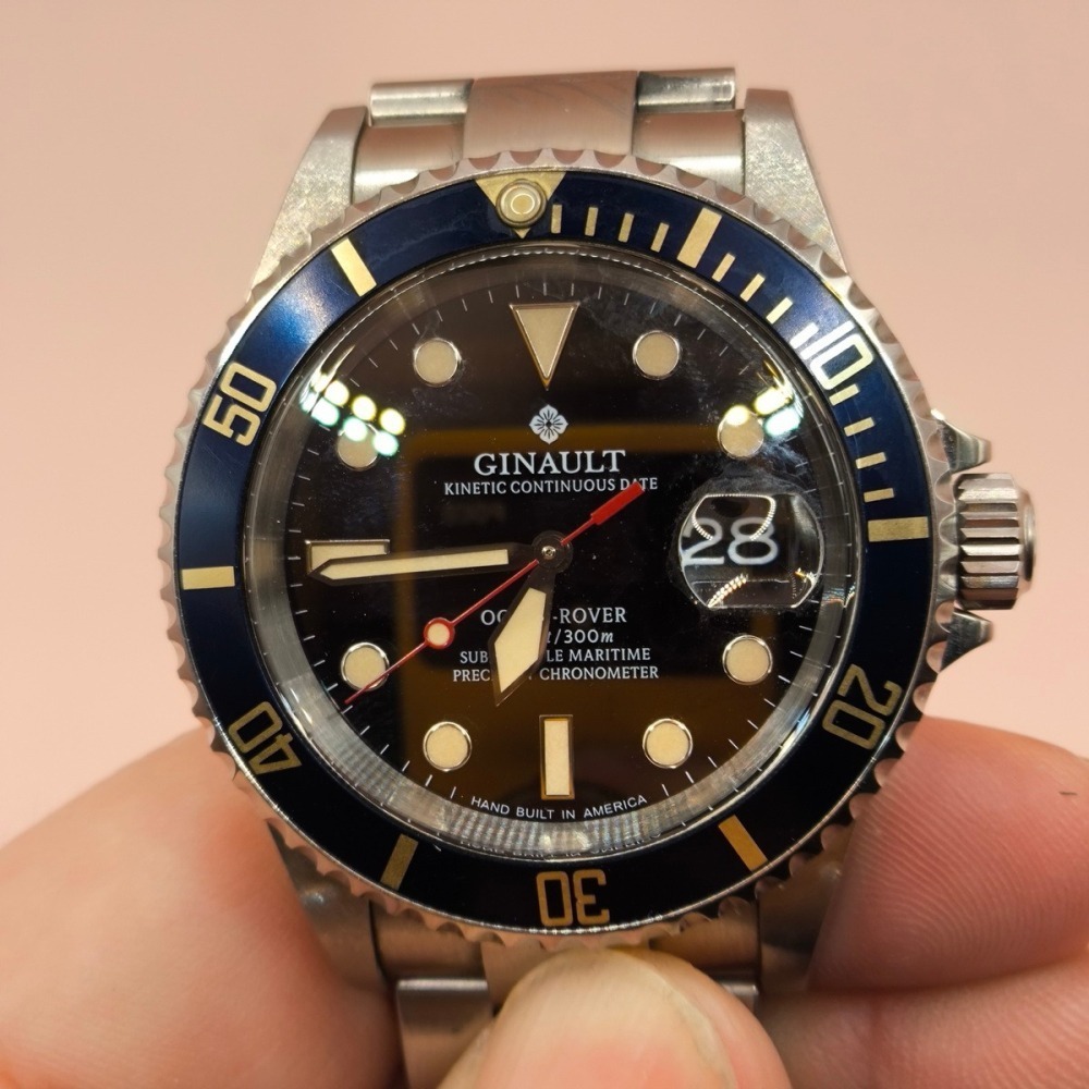 如果你想找一支最接近經典勞力士的蠔式恆動錶款,那絕對推薦吉諾錶的海洋遊俠。黑漆錶盤搭配復舊金沙時標與劍型指針,外加狗牙圈與夜明珠的鋁質錶圈,確實是記憶中的老勞模樣。此外,它的錶帶也致敬得很到位,質感滿滿的折疊式錶扣,外加可快調鬆緊的設計,讓使用者能配戴得極度舒適。 這款手錶約九成五新,僅有正常使用的微細擦痕,盒單齊全未開蓋過,每日秒差約+10(滿鍊)~ -5(半滿鍊)以下。