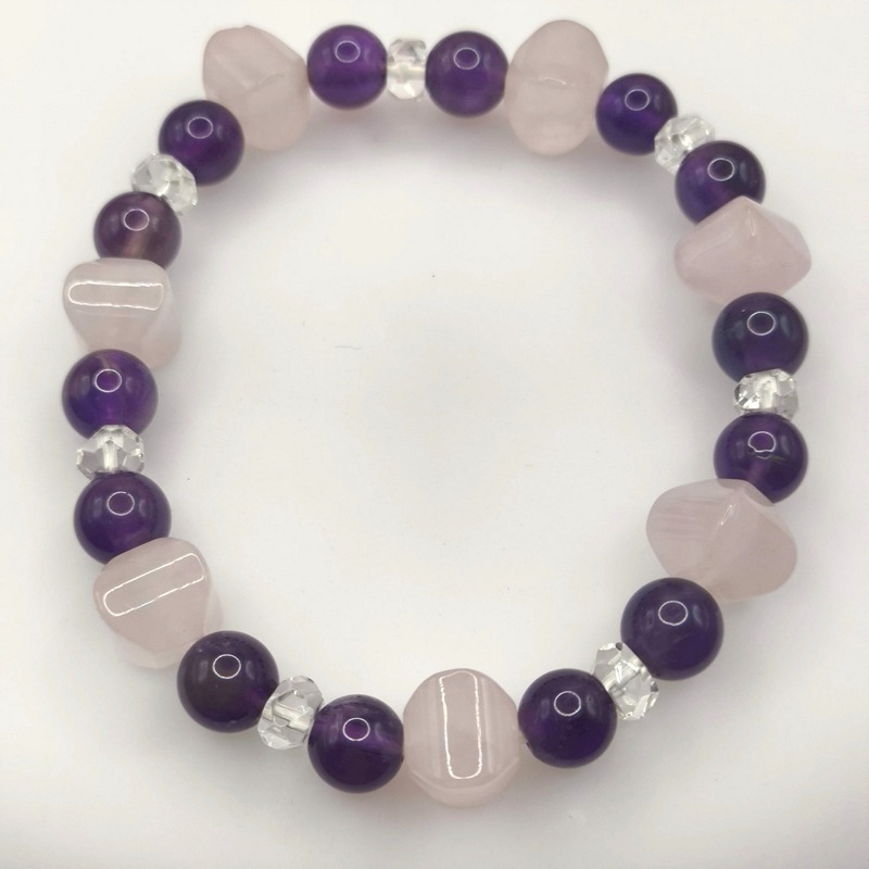 這款手鍊以深邃紫水晶圓珠搭配果凍感白玉髓不規則晶石,再以亮角切面白水晶作為點綴,整體溫柔又有質感,呈現夢幻的紫白色調。