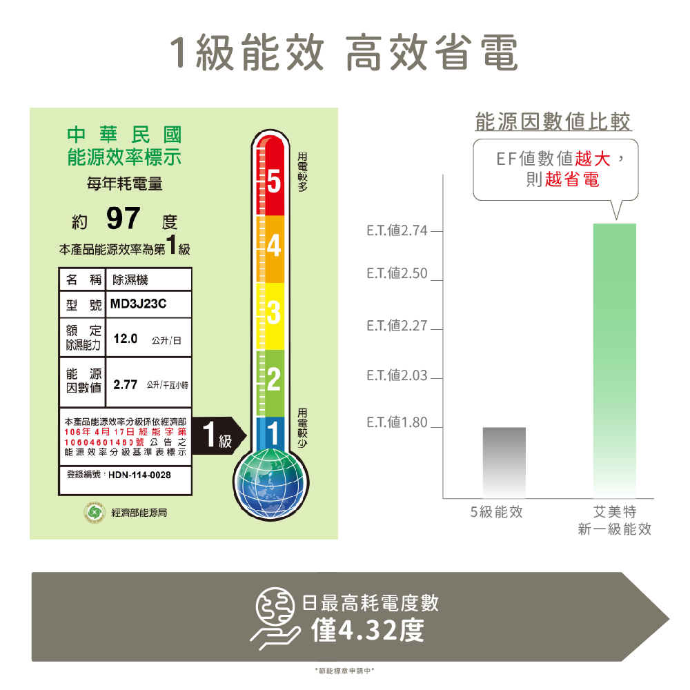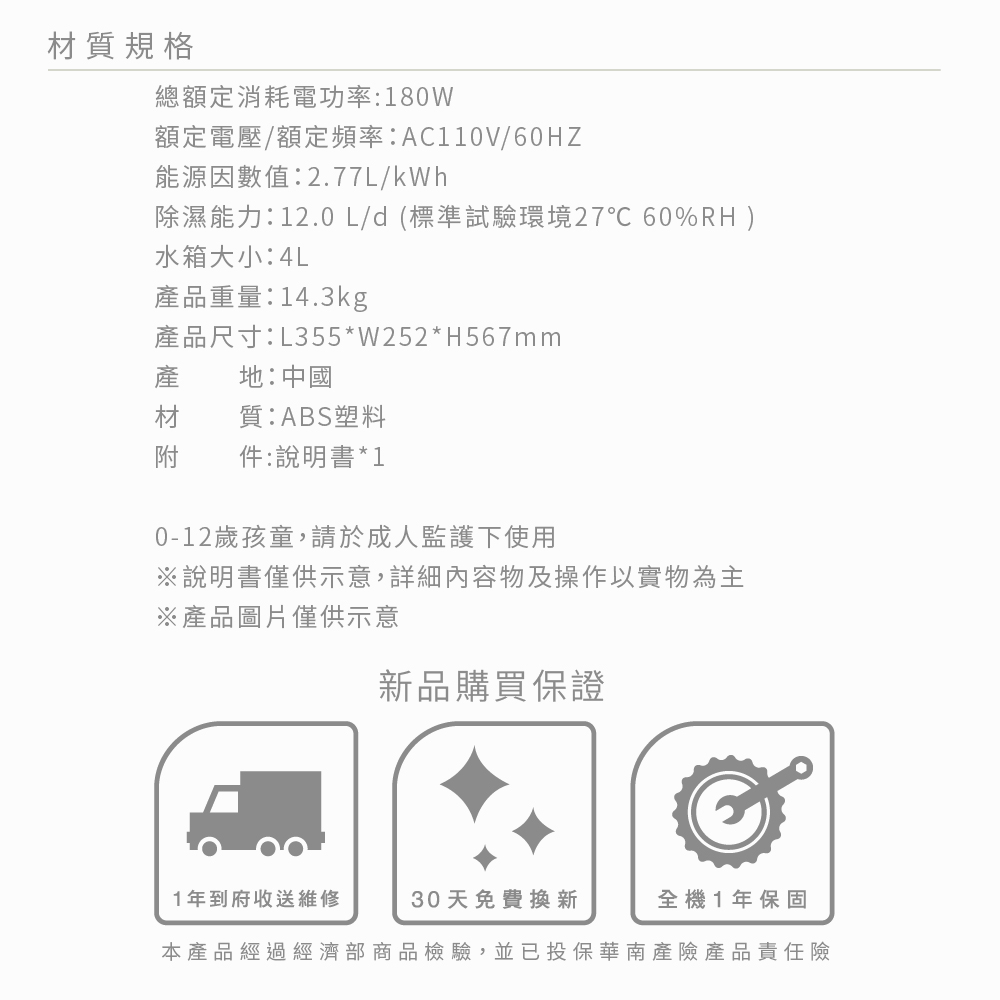1. 除濕能力:12.0 L/d (標準試驗環境27℃ 60%RH )
