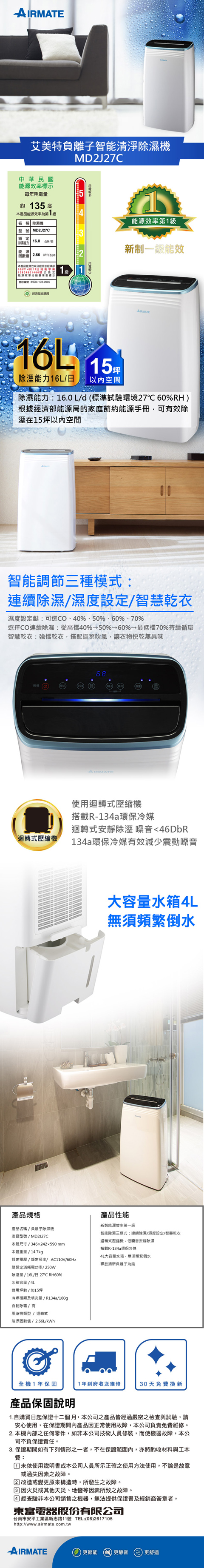 Airmate艾美特 16L負離子智能清淨除濕機 MD2J27C