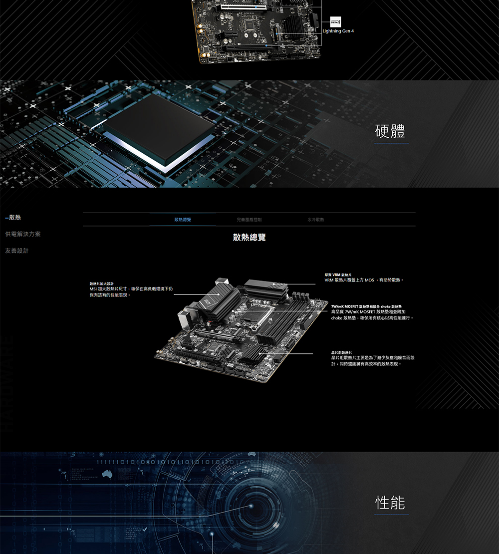 優質散熱解決方案 : 採用直觸導熱管的加大散熱片、7W/mK MOSFET 散熱墊,提供高性能系統和持久不間斷遊戲體驗