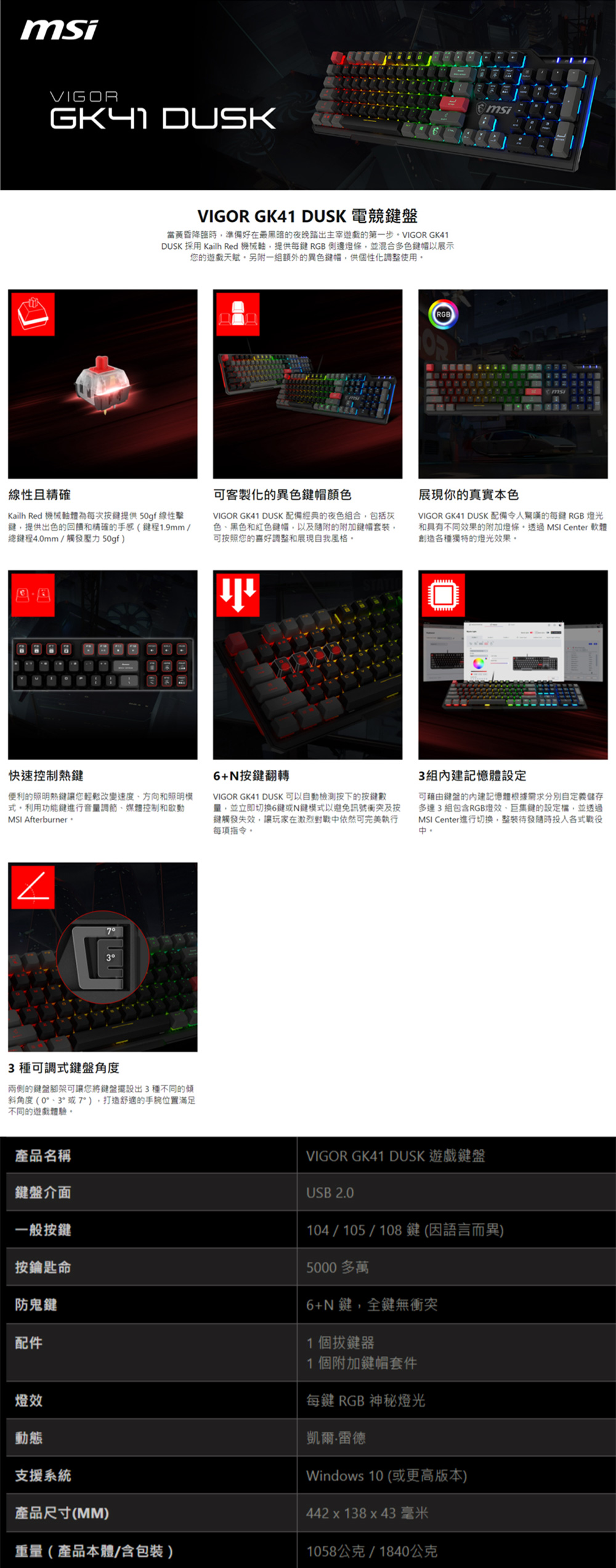 MSI 微星 VIGOR GK41 DUSK 電競鍵盤
