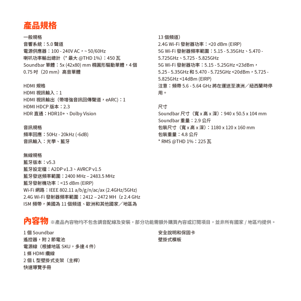 ◆ 450 W 最大輸出功率和震撼低音,不須額外搭配重低音喇叭
