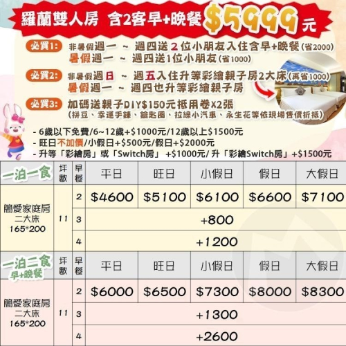 ▲【使用說明】提供給消費者參考,飯店保有更改權利如有異動依飯店公告為主 (1) 入住時間 Check In:15:00後、Check Out:隔日11:00前。 (2) 平/旺/假日定義:依官方行事曆為主;旺日不加價!小假日+$500/假日+$2000元 (3) 跨年、農曆春節期間不適用 (4) 平日週一~週四送1位小朋友入住含早+晚餐(省1000元);【9-12月】平日週一~週四再加碼送1位小朋友(共省2000元) (5) 平日週一~週四入住升等彩繪親子房2大床(再省1000元);【9-12月】週五、週日也升等彩繪親子房 (6) 升等「彩繪房」或「Switch房」 +$1000元/ 升「彩繪Switch房」+$1500元 (7) 加人費用:6歲以下免費/6~12歲+$1000元/12歲以上$1500元 (8) 提供嬰兒相關用品(消毒鍋、嬰兒床、澡盆、床圍),數量有限,敬請事先預約 (9) 床尺寸:雙人房200*200cm;四人房165*200cm (10) 全館房內皆有浴缸 (11) 優惠期限至 2025.06.11日止(※此為特殊優惠價,購買證明單載明之價值為NT$6700元,逾期視同等值抵用券,使用時須補足實際售價(含服務費)間之差額,購買前請謹慎考慮) ※購買證明單逾期恕不接受退貨或換貨!!