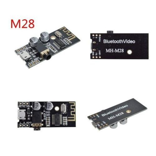 產品簡介: 本產品MH-M28為低功耗藍牙設計方案,支持最新藍牙4.2傳輸,雙聲道身歷聲無損播放,模組連接上藍牙後,便可快速實現藍牙無線傳輸,非常便捷。空曠環境下,藍牙連接距離可達20米。 廣泛應用於各種藍牙音訊接收,各種音響DIY改裝等。 功能說明: 藍牙V4.2版本,支援藍牙自動回連技術,支援WAV/WMA/FLAC/APE/MP3無損解碼,立體雙聲道輸出。 模組上電後,手機搜索到藍牙名字MH-M28,連接上藍牙後即可播放音樂; 模組藍色指示燈: 藍牙未連接時,指示燈快閃; 藍牙連接上時,指示燈常亮; 藍牙在播放時,指示燈慢閃。 MH-M28 腳位說明 1 5V: 電源正極5V 2 GND: 電源負極 3 VBAT: 鋰電池正極3.7-4.2V 4 L: 左聲道輸出 5 R: 右聲道輸出 6 AGND: 音訊地 1.供電電源:可以直接用MICRO USB安卓線5V直接進行供電使用,也可以另外接入5V電源或者3.7V鋰電池(如下圖所示)。注意5V和3.7V的供電介面不一樣,5V電壓接在5V和GND上,3.7V鋰電池接在VBAT和GND上。 2.音訊輸出:耳機可直接接入3.5mm音訊介面,也可以接線用於功放板的音訊輸入(如圖所示的介面L/R/AGND可直接接線)。