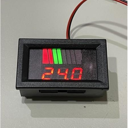 此賣場3位7段顯示器為紅色 本電量錶適合12V、24V、36V、48V、60V電瓶車使用。也可用於其它電量/電壓測量用途。不適合:大貨車,吊車 叉車等大功率高負載的車使用!   產品特色: 1、雙顯電量+電壓一目了然。顯示更直觀。上行8格彩條顯示(2紅6綠)電池電量。下行電壓表(顯示電池電壓),電壓表小數點自動移位元精度更高。 2、使用範圍廣,鉛酸電池,汽車電瓶,電動車電池,等多種類型電瓶電動設備均可使用。既有電壓計算和電動車的電量顯示表原理相同。 3、表頭自動識別電壓電量,具有反接保護功能(反接不會燒). 使用說明:表頭兩線制,可以直接測試電瓶 技術參數:  電壓允許誤差±2%; 8 段電量 % 90% 全滿 工作電流5~15 ma 刷新速度約300mS一次 顯示方式  三位0.56”LED數碼管 顯示顏色  紅色 引線長度15cm 外形尺寸48 x 29 x 22 mm,長X寬X厚; 安裝孔46 x 27 mm 工作溫度-10℃~65℃