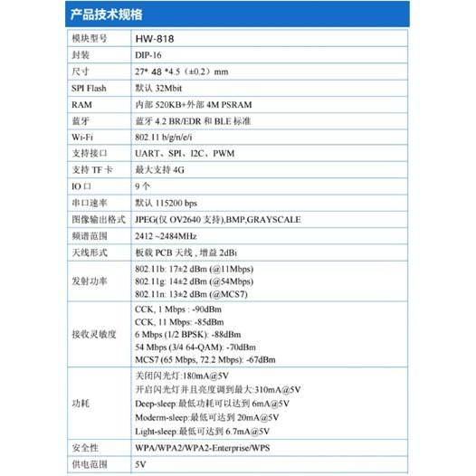 ESP32-CAM-CH340 攝像頭模組簡介 產品名稱: ESP32-CAM-CH340 攝像頭模組 工作電壓:DC 5V 產品尺寸:27*40.5*4.5mm(不計排針) 產品應用:該模組可廣泛應用於各種物聯網場合,適用于家庭智慧設備,工業無線控制,無線監控,QR無線識別,無線定位系統信號以及其他物聯網應用。採用DIP 封裝,直接插上底板即可使用。