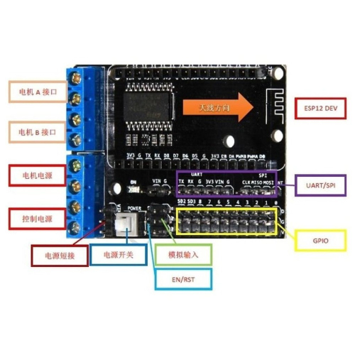 注意: 本商品為實驗開發零組件,此商品非以接頭連接後即可直接使用之射頻模組,非屬電信管制射頻器材。 介紹: 基於ESP-12E開發的首款電機驅動擴展板。 特 點: ESP12 DEV KIT開發板擴展模組; 引出ESP12 DEV KIT所有功能引腳:SPI、UART、GPIO、AI以及3.3V電源介面; 擴展兩路電機驅動,可直接驅動兩路電機; 板載電源開關; L293D 電機電源範圍:4.5V~36V; 控制電源範圍:4.5V~9V; 電機電源、控制電源分離;在實驗中,可通過短路塊合併,將VIN和VM短接,同時給電機和控制板供電。 產品技術規格 電源輸入: ~ 電機電源(VM):4.5V~36V,可單獨供電; ~ 控制電源(VIN):4.5V~9V(10VMAX),可單獨供電; ~ 模組提供短路子(短路VM和VIN),可以方便地使用一路電源(必須4.5V~9V)同時完成電機的驅動與控制; 邏輯工作電流Iss:≤60mA(Vi=L),≤22mA(Vi=H); 驅動部分工作電流Io:≤1.2A; 最大耗散功率:4W(T=90℃) 控制信號輸入電平:高電平:2.3V≤VIH≤VIN;低電平:-0.3V≤VIL≤1.5V 工作溫度:-25℃~+125℃ 驅動形式:雙路大功率H橋驅動 ESP12E Dev Kit控制埠:D1,D3(A電機);D2,D4(B電機)