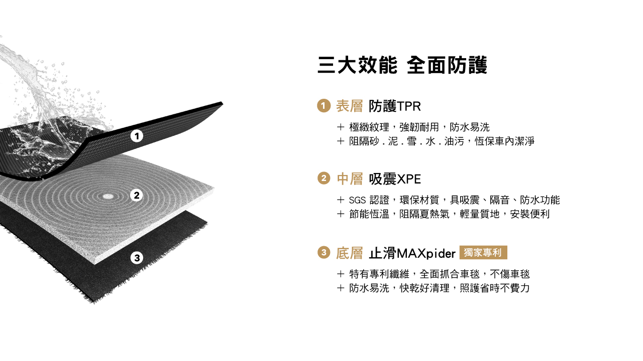 ●  導水溝槽設計,隔離砂泥.雪.水.髒污於溝槽內