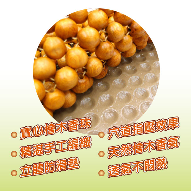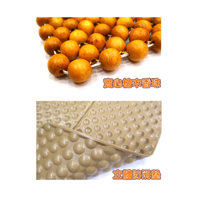 來自大自然1700米高山環境,青山綠水孕育出高級檜木製成之健康坐墊。檜木中含有天然芬多精,不受蟲蛀、並對微生物及化學溶劑皆有一定性的抗腐效果,對於人體健康亦有幫助。搭配在汽車座椅,木珠本身具有的天然香氣,而且透氣不悶熱,最適合長坐者使用,不論是皮製或布製的座椅皆可使用,【3D檜木坐墊隨商品附送立體專屬防滑墊;使坐墊不易滑動,並有效保護原車內皮椅】,會伴隨陣陣的原木香味,持久不散!
