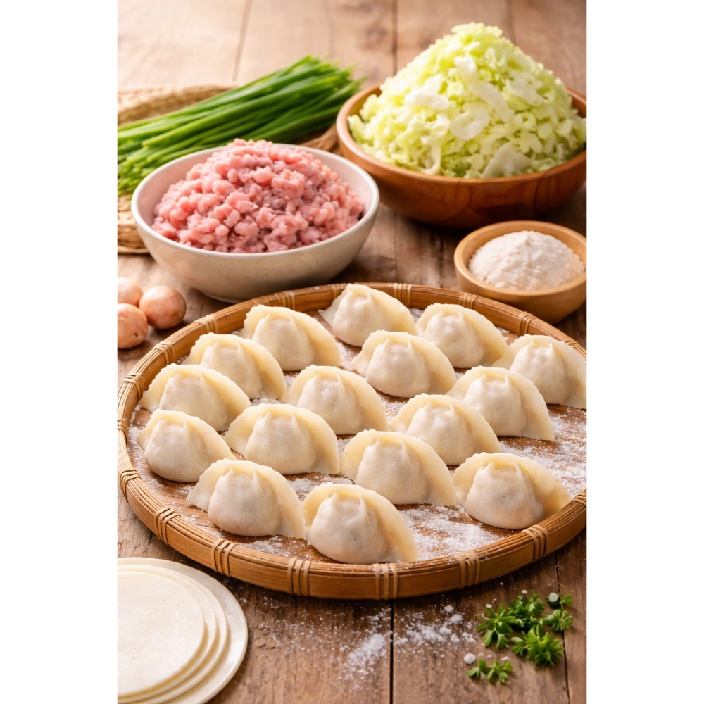 手工包製冷凍生水餃,採用新鮮豬絞肉搭配高麗菜與韭菜,不使用現成調理包或大量工廠製品,為接單後手工製作。