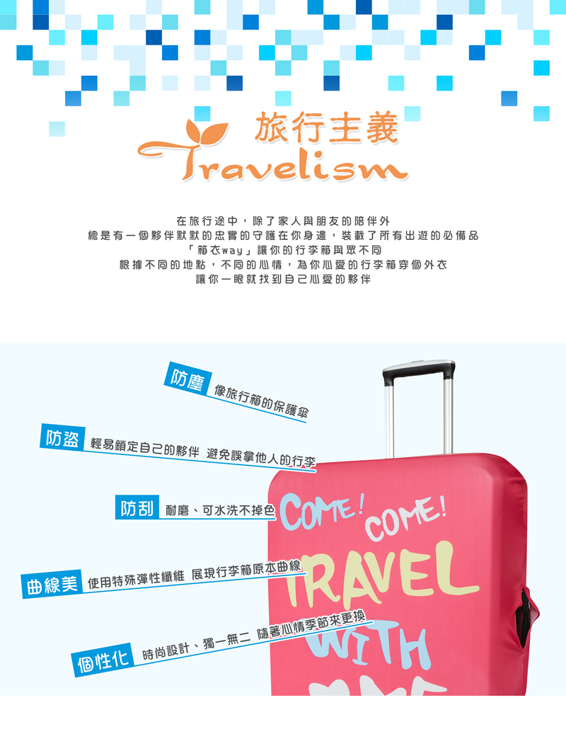 箱套讓你的行李箱與眾不同,根據不同的地點,不同的心情,為心愛的它穿個外衣,讓你一眼就能找到自己心愛的夥伴。