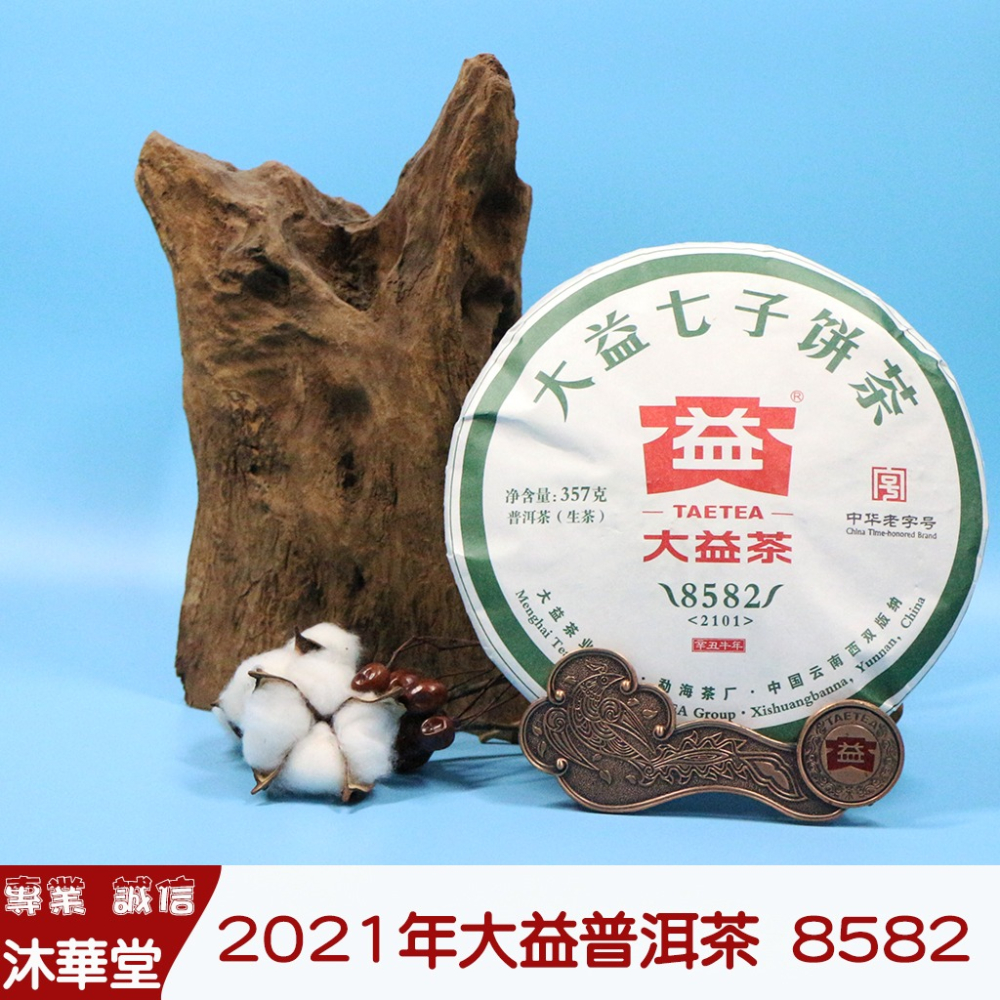 大益嘜號8582的青餅代表的是1985年研製完成配方,並於同年首批生產,它採用的是3至8級茶青拼配緊壓,其中3、4級茶菁為鋪面,5~8為裏茶,綜合茶菁等級為8,而最後一個數字2則是當時國營的勐海茶廠其代號為2。論到8582的誕生,就必須提到香港南天貿易公司,80年代中國的普洱茶銷售狀況並不好,要想外銷,其市場目標第一就是指向香港,而普洱茶生茶因為生產步驟相對簡單,當時又多以茶園茶為主,所以苦澀程度相對較重,南天公司認為應調整原來(7542)的配料比例,增加粗大原料和茶餅的疏松透氣性,以加速自然陳化發酵,因此才有8582此一配方的誕生。