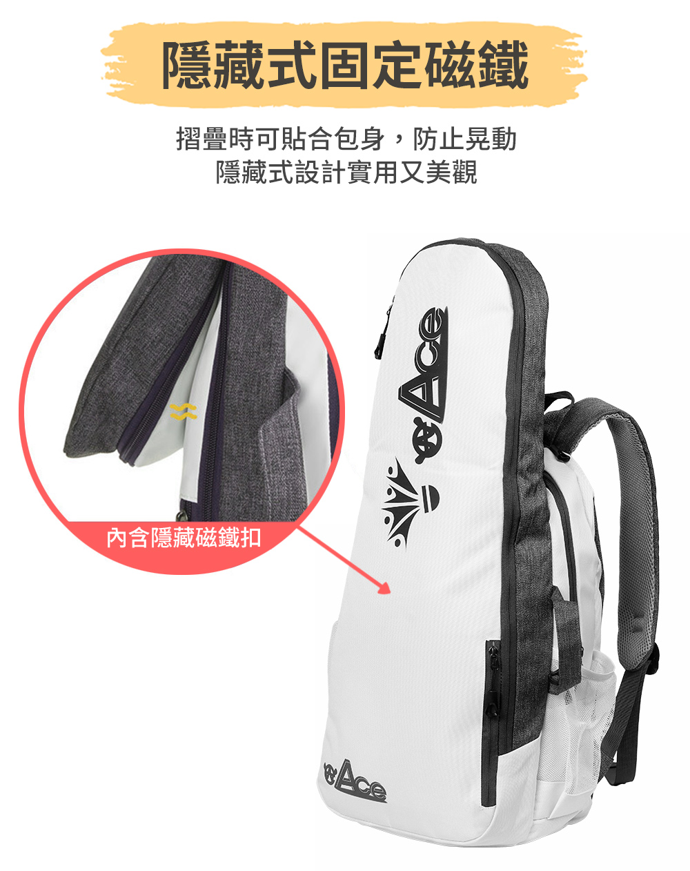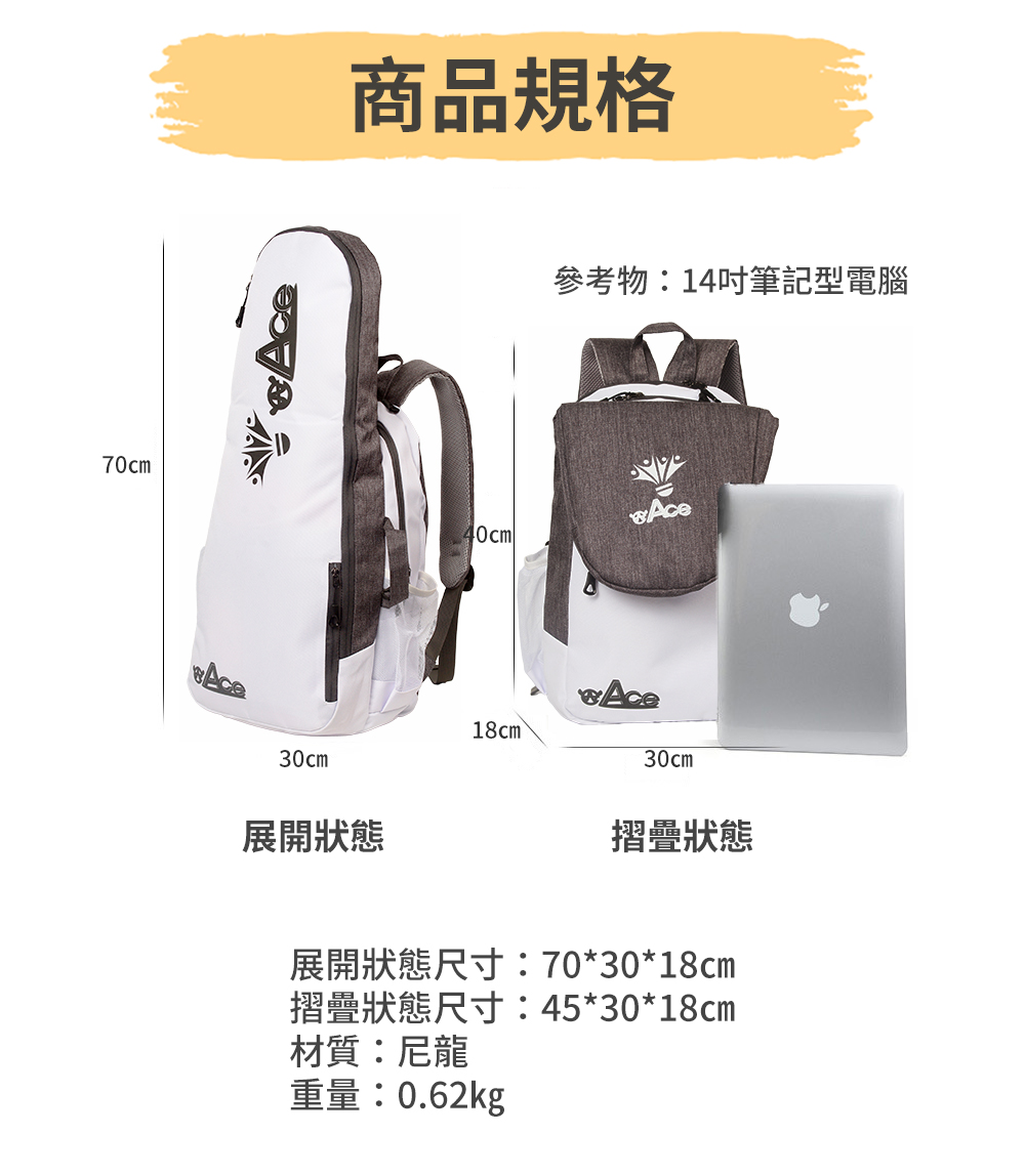 主袋大容量可收納各式物品,前袋可收納2-3隻羽球拍
