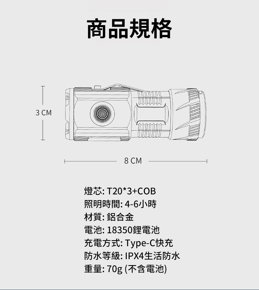 Type-C快充設計,高容量鋰電照明時間可持續4-6小時