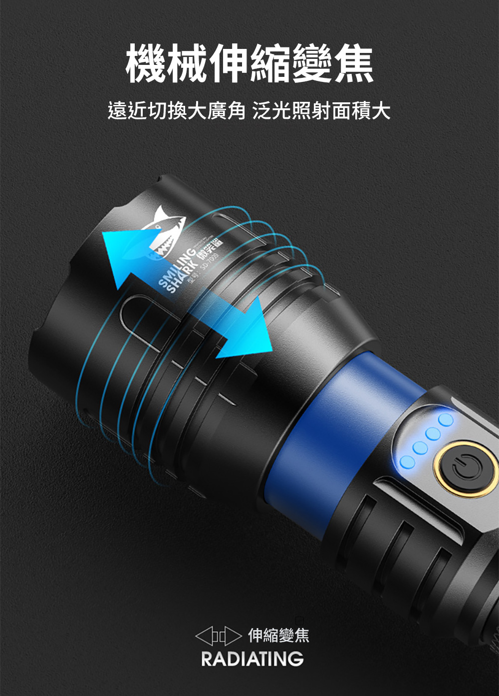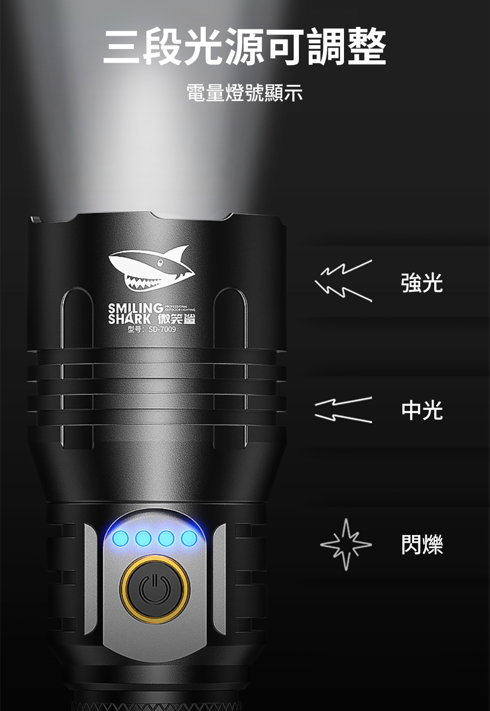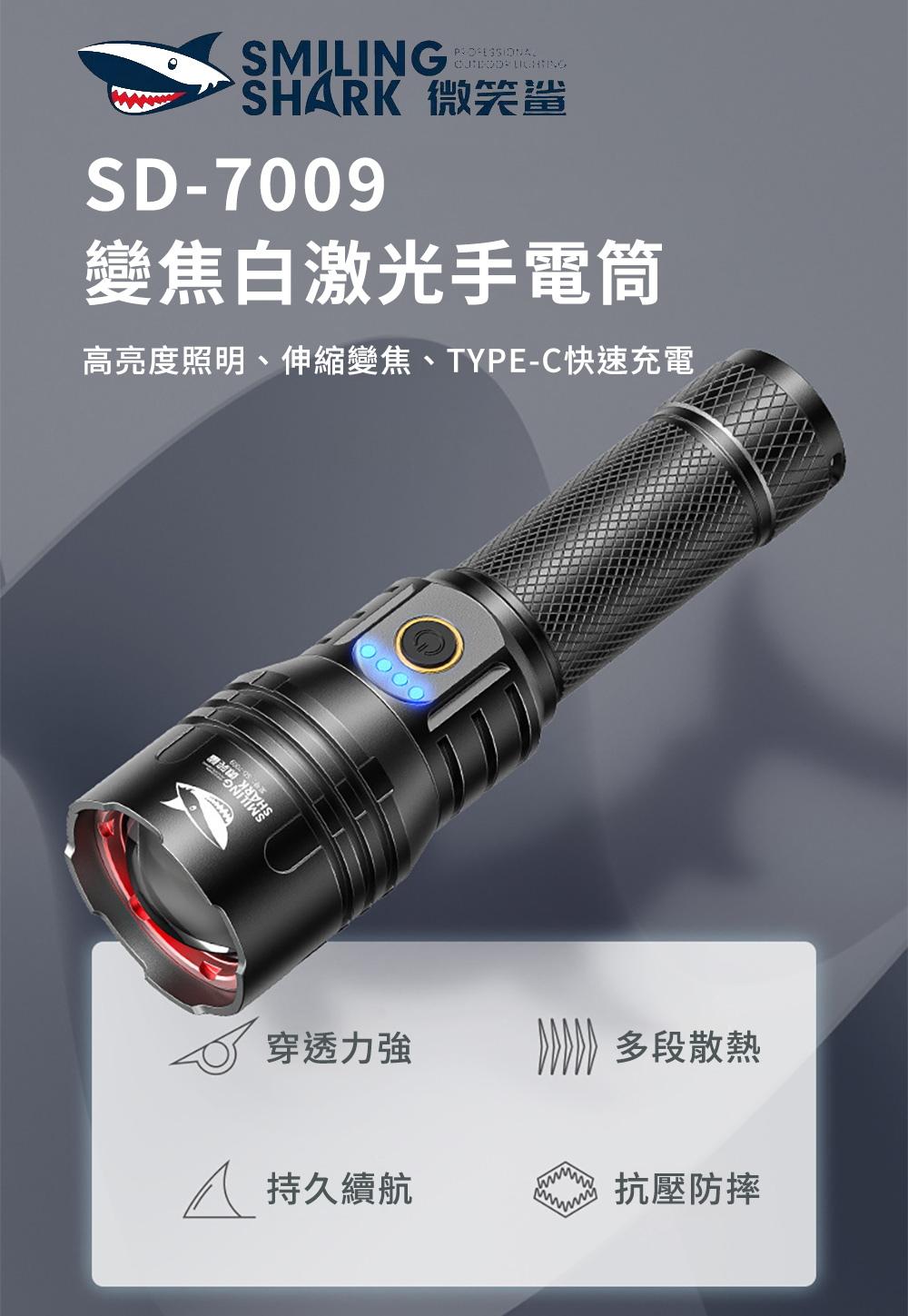微笑鯊【SD7009 變焦白激光手電筒】防水 強光手電筒 充電手電筒 伸縮手電筒 露營 登山 釣魚 戶外照明 長續航