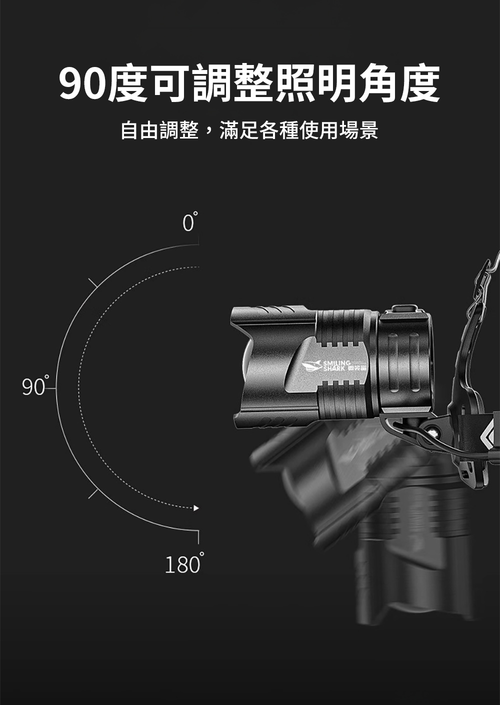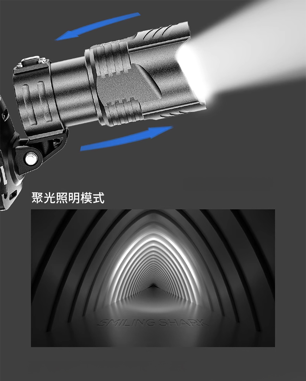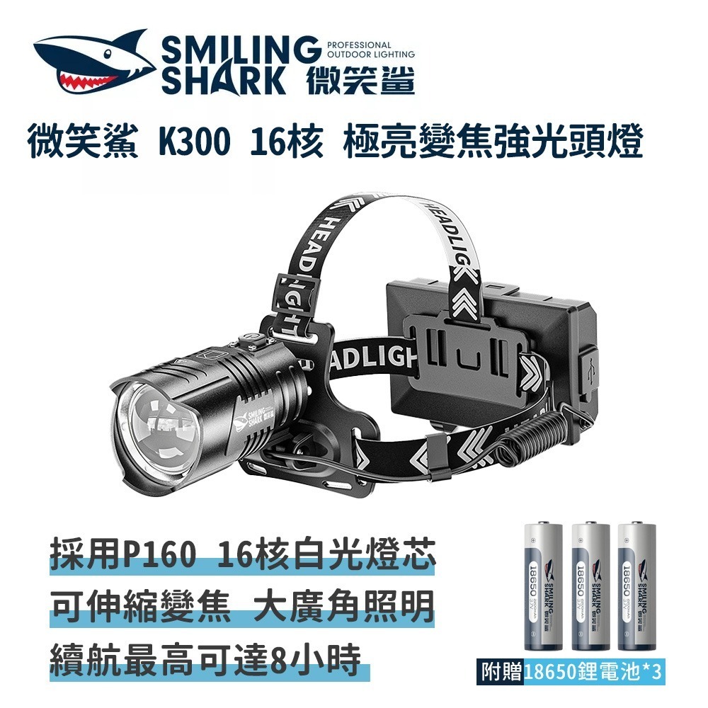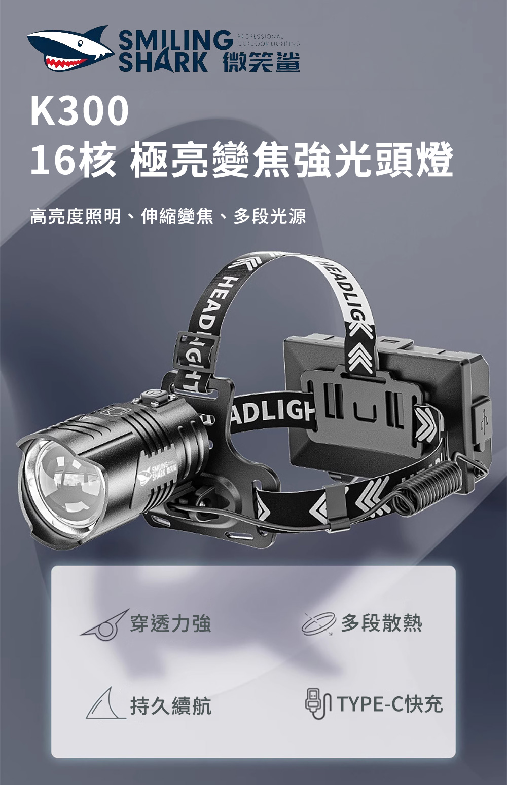 微笑鯊【K300 16核 極亮變焦強光頭燈】頭戴式頭燈 釣魚頭燈 夜釣燈 充電頭燈 工作 頭燈 露營燈 登山 戶外照明