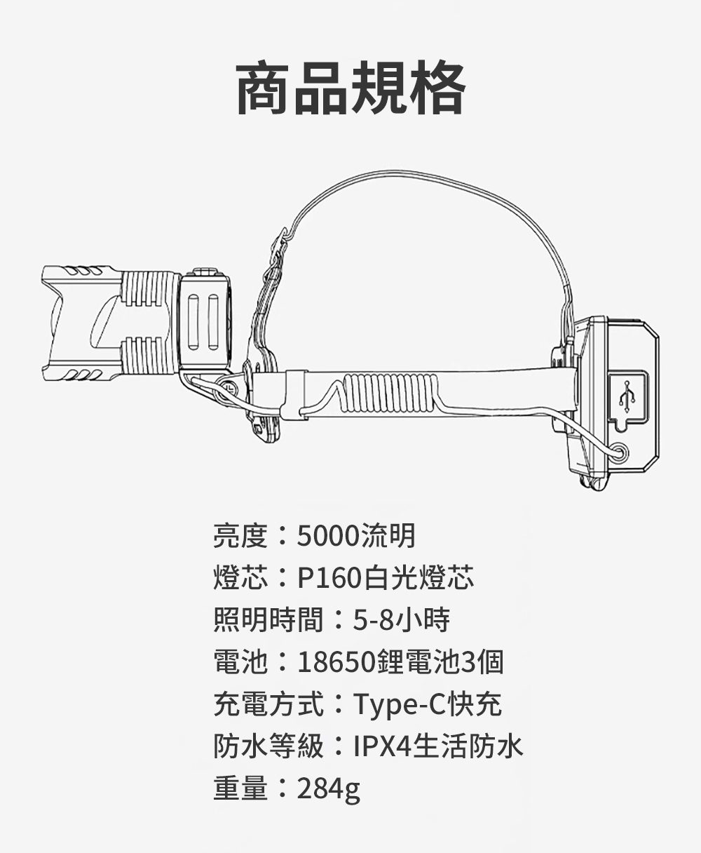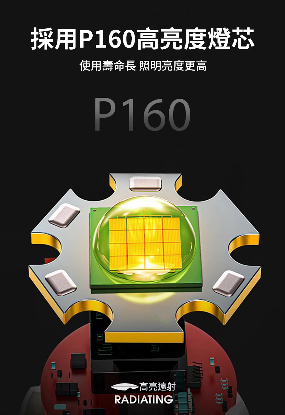 採用P160 16核強光燈芯,照明亮度高約5000流明