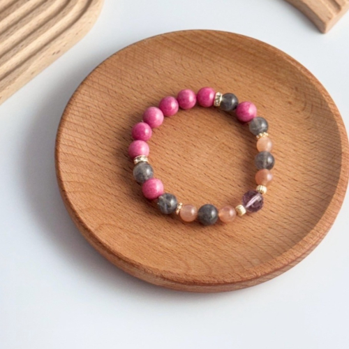 這串手鍊由薔薇石、灰月光、奶茶月光與鑽切紫水晶組成,