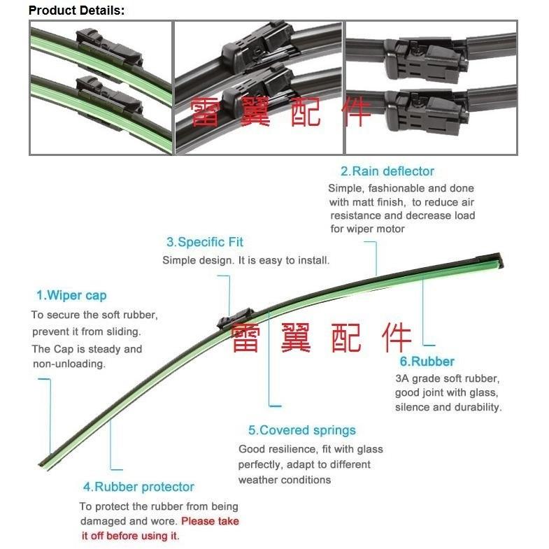 202/03~2014~ ML350/GL350軟骨雨刷 車系適用 (26"+22") 共兩支一組 商品提供 方塊固定扣 專用雨刷 如圖 請務必確認您的愛車原雨刷結構 售價為一對兩支售價 例如15吋約為375mm~385mm,一般約10mm範圍調整 專用軟骨雨刷 務必確認接頭形式喔^_^ 直接安裝,接頭免改造~ DIY超容易 產品特點: 1、超長的使用壽命,帶給您更長久清晰的雨中駕駛環境。 2、雨刮片根據車窗表面的弧度精確定制,壓力均勻分佈於與車窗接觸的雨刮片橡膠表 面,確保在惡劣氣候條件下最佳的視野與安全。 3、動感、前衛的空氣動力學導流板設計,確保在高速行駛下的出色表現。您在享受高速駕駛快感的同時,也在感受著超靜、流暢的優良拭刮效果。 新技術、新功能: ◆外形與功能的完美結合 ◆優美的無支架外觀 ◆一體式的空氣動力學導流板 ◆張緊的弧線確保雨刮片與車窗表面完美的貼合 注意事項: 1、使用雨刮前,請先清洗橡膠片上的所有灰塵。 2、如果擋風玻璃上有油、蠟、汙物等異物,先處理乾淨後使用。否則雨刮片不能正常 工作,會縮短使用壽命。 3、在雨中駕駛時噴灑清洗劑以便獲得更好的擦拭效果和延長使用壽命。 ◆金屬部件包裹於橡膠材質之中,避免腐蝕的發生 ◆表面減小,使風噪最小化