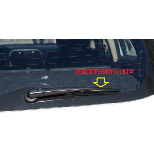 請確認您的後雨刷 從後方看是否為如圖的雨刷樣式 【產品名稱】各車款專用後雨刷,非一般通用U型卡扣固定 【適用車型】如物品名稱,車款有分年份雨刷接頭亦不同 歡迎跟前雨刷一起購買,謝謝您。