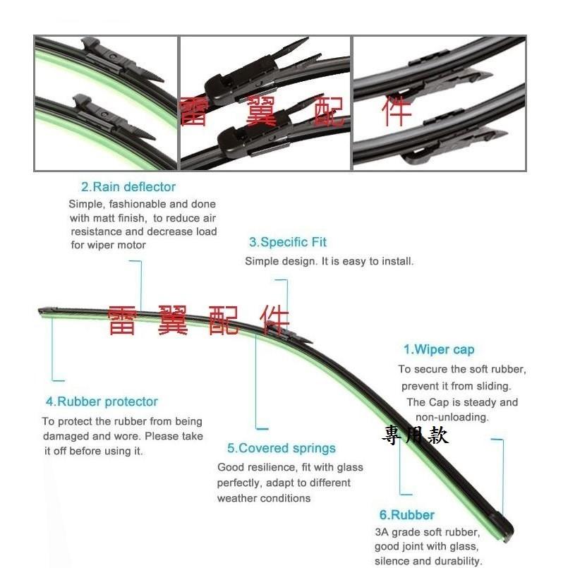 NEW SMART FORTWO 451車系適用 請酌量選擇適合的雨刷尺寸,謝謝您 24"+22"或是21"+21"或是22"+22"或者24吋+21吋或23吋-21吋或22吋-21吋 皆是對開式雨刷專用的擾風面 共兩支一組 商品提供 對開式專用雨刷 如圖 ,非一般通用無分擾風面的款式 請務必確認您的愛車原雨刷結構 售價為一對兩支售價 例如15吋約為375mm~385mm,一般約10mm範圍調整 專用軟骨雨刷 務必確認接頭形式喔^_^ 直接安裝,接頭免改造~ DIY超容易 產品特點: 1、超長的使用壽命,帶給您更長久清晰的雨中駕駛環境。 2、雨刮片根據車窗表面的弧度精確定制,壓力均勻分佈於與車窗接觸的雨刮片橡膠表 面,確保在惡劣氣候條件下最佳的視野與安全。 3、動感、前衛的空氣動力學導流板設計,確保在高速行駛下的出色表現。您在享受高速駕駛快感的同時,也在感受著超靜、流暢的優良拭刮效果。 新技術、新功能: ◆外形與功能的完美結合 ◆優美的無支架外觀 ◆一體式的空氣動力學導流板 ◆張緊的弧線確保雨刮片與車窗表面完美的貼合 注意事項: 1、使用雨刮前,請先清洗橡膠片上的所有灰塵。 2、如果擋風玻璃上有油、蠟、汙物等異物,先處理乾淨後使用。否則雨刮片不能正常 工作,會縮短使用壽命。 3、在雨中駕駛時噴灑清洗劑以便獲得更好的擦拭效果和延長使用壽命。 ◆金屬部件包裹於橡膠材質之中,避免腐蝕的發生 ◆表面減小,使風噪最小化 ~~雷翼配件 感謝您~~