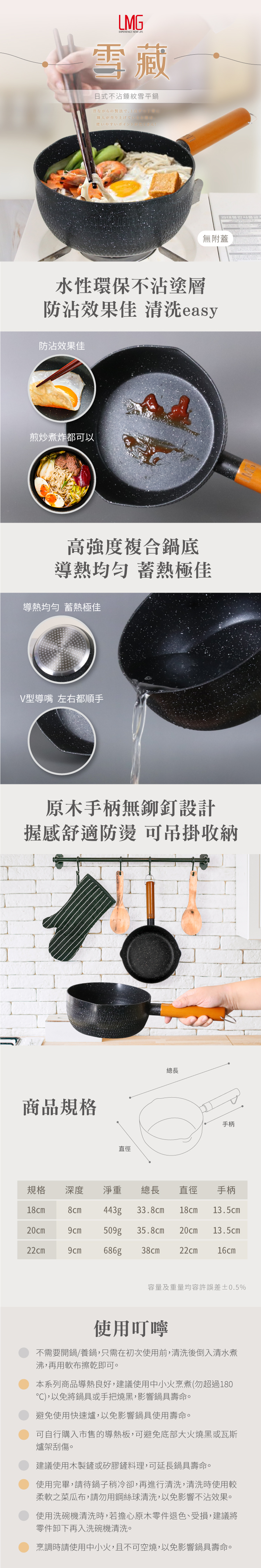 鍋長約21.5cm(內徑20cm)、高8.5cm、手柄長約16.5cm