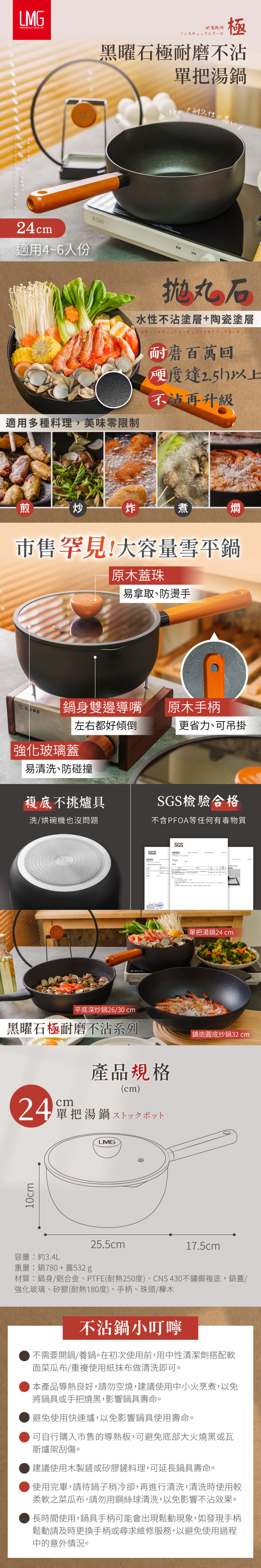 單把湯鍋24cm:約全長43cm(含手柄)*寬24cm*高10cm
