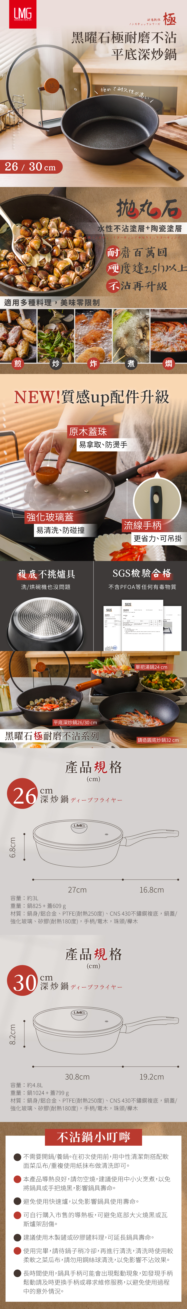 【LMG】黑曜石極耐磨不沾平底深炒鍋-26cm/30cm(附蓋)