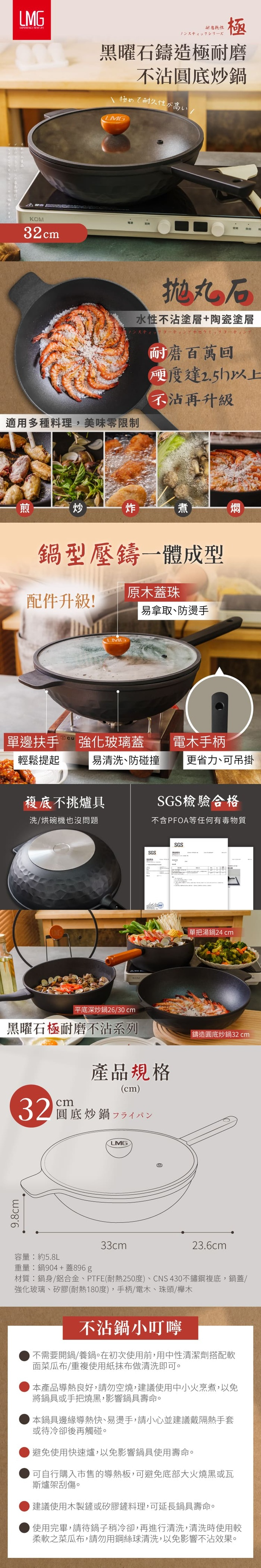【LMG】黑曜石極耐磨不沾鑄造圓底炒鍋-32CM(附蓋)
