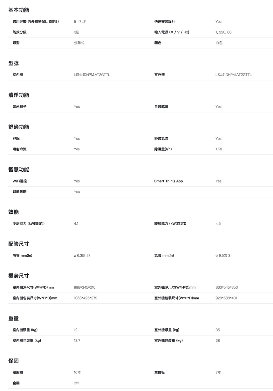 LG 樂金 5-7坪 DUALCOOL WiFi雙迴轉變頻空調 旗艦冷暖型 4.1k LS-41DHPM (含基本安裝)