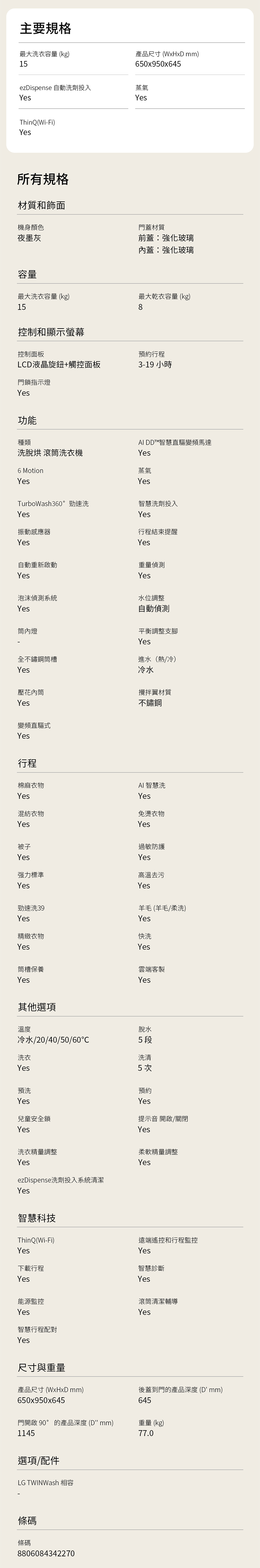 LG 樂金 15公斤 滾筒洗衣機|夜墨灰|AI DD™ 蒸洗脫烘 WD-S15NDB (含基本安裝)