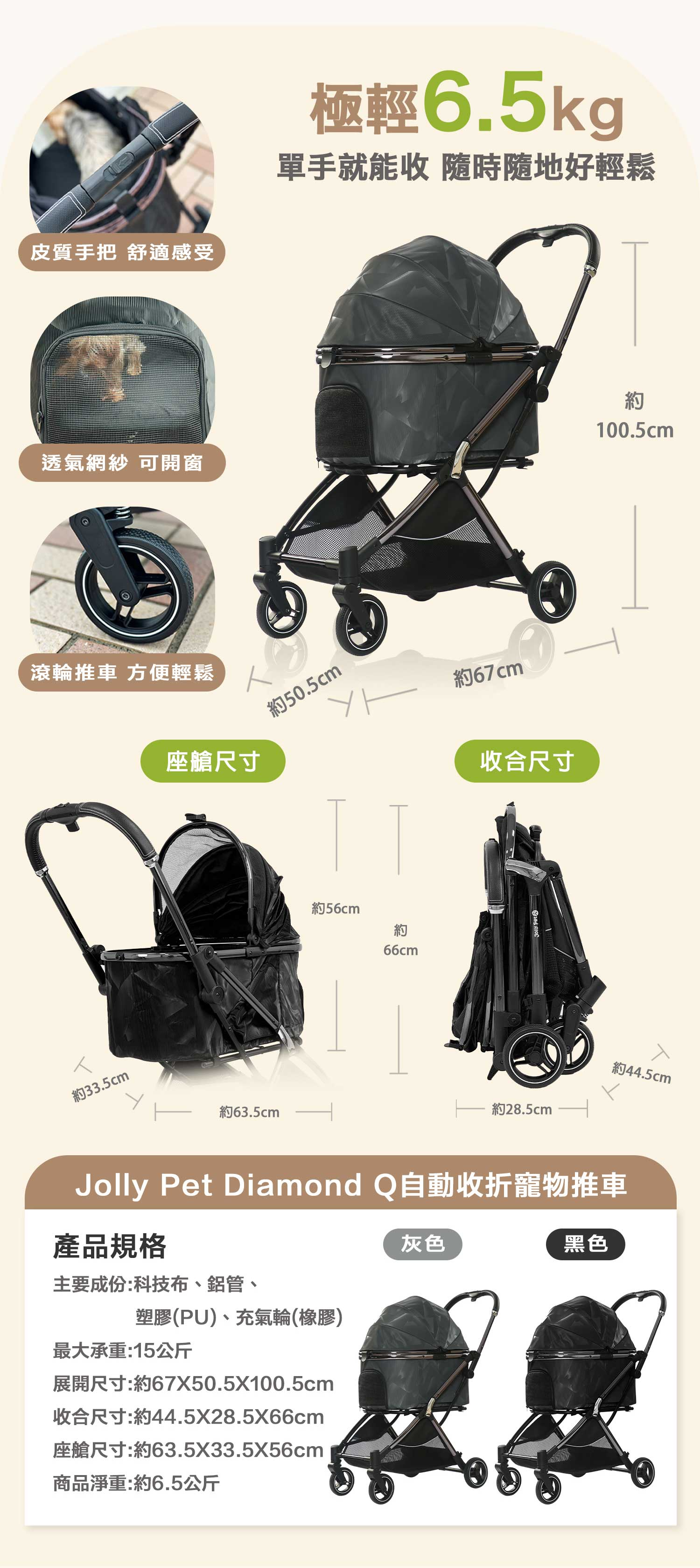 【JollyPet】Diamond Q自動收折寵物推車(兩色)單手一鍵收折 可拆式坐墊 母嬰級推車 四輪 摺疊 貓狗通用