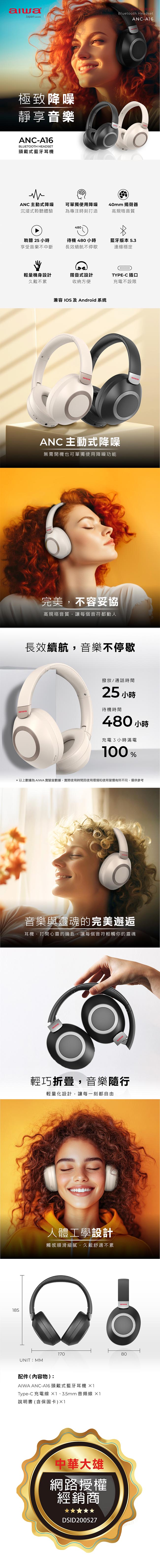 AIWA愛華 ANC降噪頭戴式藍牙耳機 ANC-A16