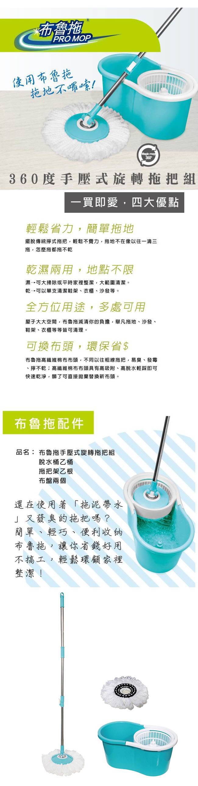 材質:〈脫水桶〉聚丙烯PP、〈拖把架〉不鏽鋼、聚甲醛、ABS、PP聚丙烯、〈布盤〉超細纖維材質、PP聚丙烯