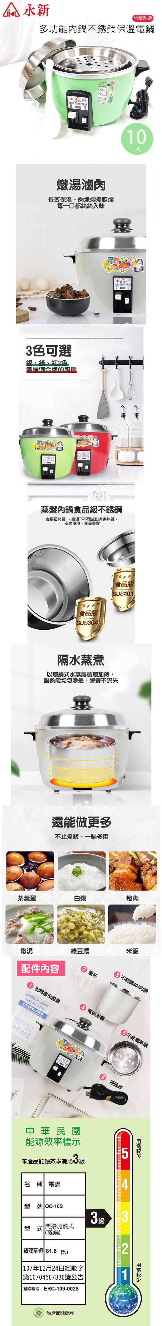 永新牌 10人份304不鏽鋼多功能保溫電鍋110V(附配件)台灣製造 綠色 QQ-10S-G