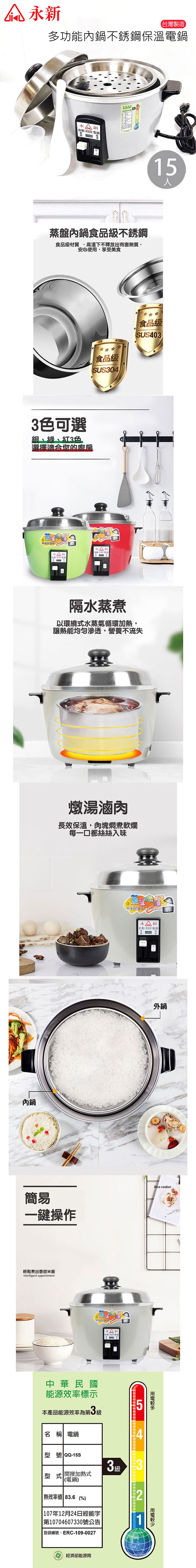 永新牌 15人份304不鏽鋼多功能保溫電鍋(附配件)台灣製造 銀色 QQ-15S-S