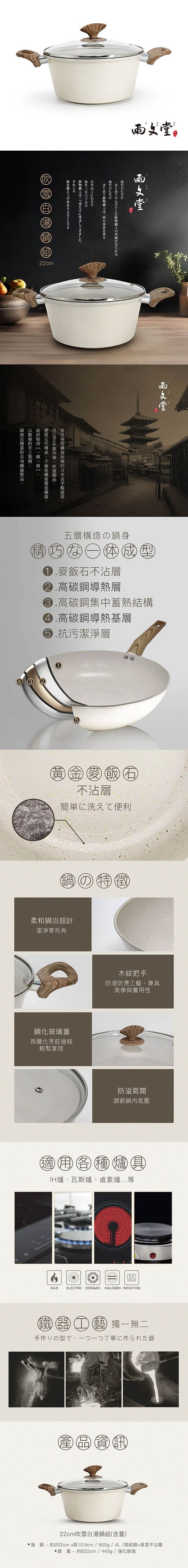 雨文堂UBUNDOU 麥飯石吹雪白不沾湯鍋22cm(含蓋)4L