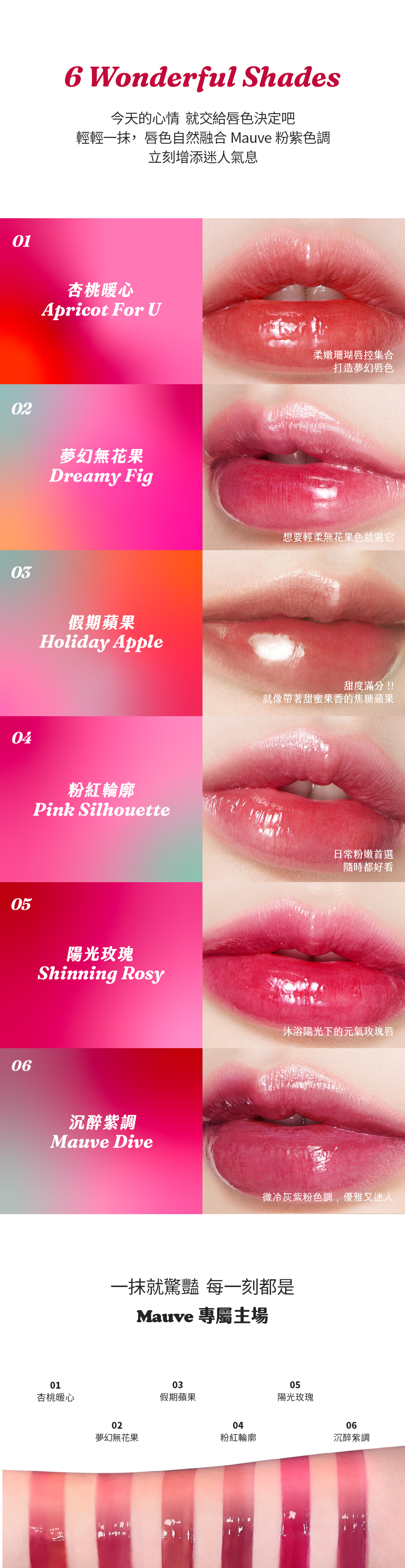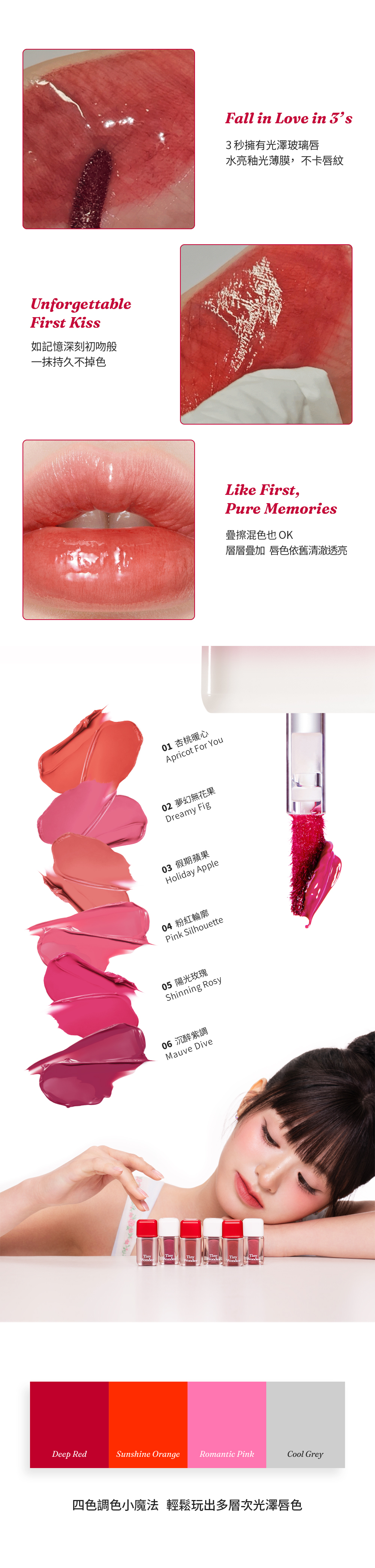 - 光澤感極強、滑順保濕的水光唇釉,強調如玻璃般的高光亮度